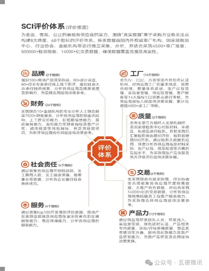 采筑聯(lián)合100+開發(fā)商、80+設(shè)計機構(gòu)、15+金融機構(gòu)、11家國內(nèi)外權(quán)威認證機構(gòu)、30家國家級檢測中心、11家行業(yè)協(xié)會等成立SCI共建聯(lián)盟,以專業(yè)的視角、嚴謹?shù)脑u審體系、龐大的數(shù)據(jù)基礎(chǔ),圍繞“真實.數(shù)據(jù)”,基于采購方業(yè)務(wù)關(guān)注點,提取工廠、質(zhì)量、交易、產(chǎn)品力、服務(wù)、社會責任、財務(wù)、品牌共8大維度68個細分指標對供應(yīng)商進行全面評價,使用一手數(shù)據(jù)客觀公正輸出“SCI”,為行業(yè)及用戶提供更加真實、專業(yè)的數(shù)據(jù)服務(wù),賦能產(chǎn)業(yè)鏈高質(zhì)量發(fā)展。